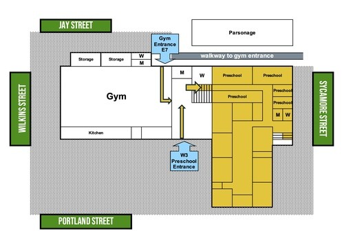 In the event that there is a tornado warning, those living in our neighborhood are invited to seek shelter in our church basement. See the pictures below for what doors will be open, and how to get to the basement once inside the church building. A staff person from the church will be on-site to help guide people. Emergency supplies, such as water, blankets, and first-aid, are available at the church if needed.